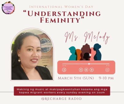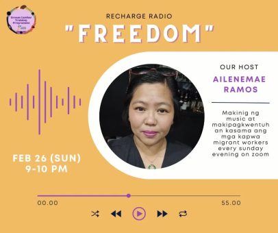 Come and join us this Sunday 9-10pm on Recharge Radio! Chat with fellow Filipino migrant workers while listening to your favorite singers to relax and lose our stress!
